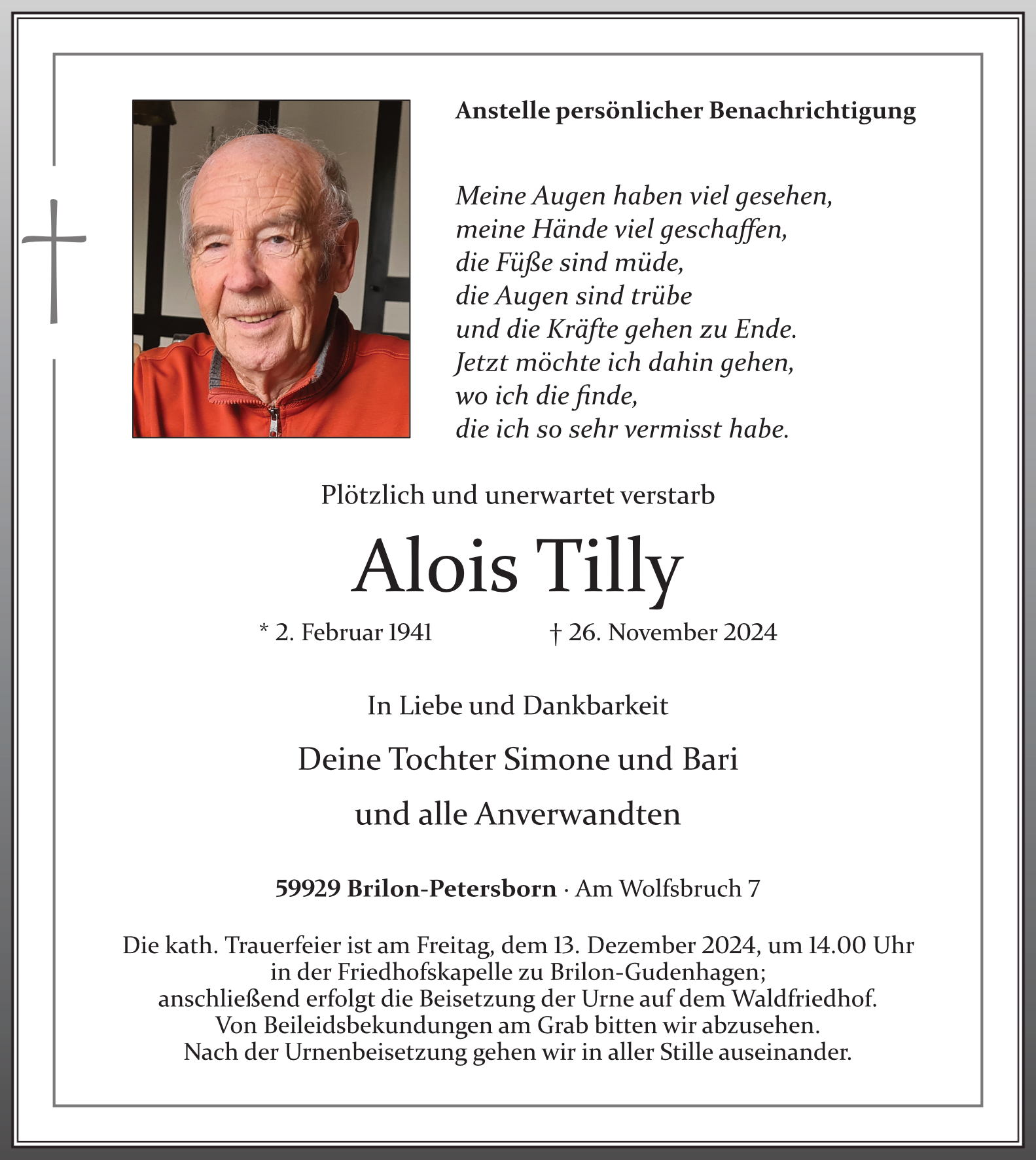 Die kath. Trauerfeier ist am Freitag, dem 13. Dezember 2024, um 14.00 Uhr in der Friedhofskapelle zu Brilon-Gudenhagen; anschließend erfolgt die Beisetzung der Urne auf dem Waldfriedhof.