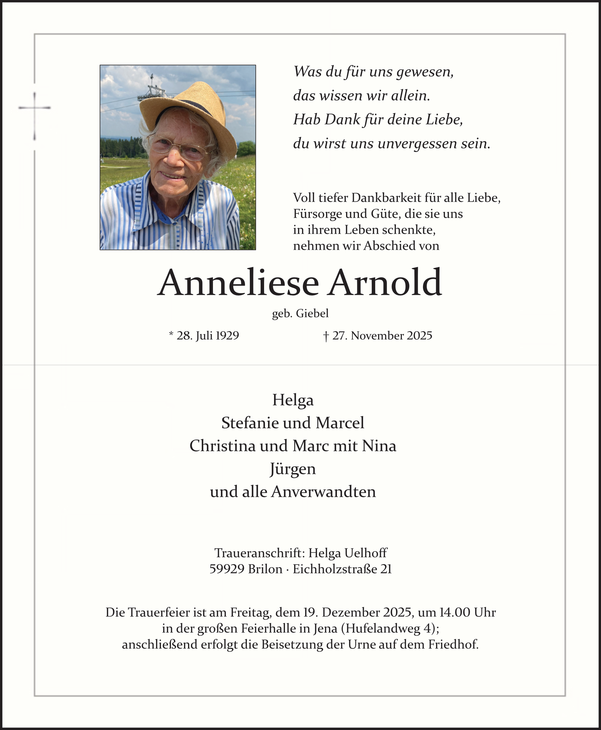 Die Trauerfeier ist am Freitag, dem 19. Dezember 2025, um 14.00 Uhr in der großen Feierhalle in Jena (Hufelandweg 4); anschließend erfolgt die Beisetzung der Urne auf dem Friedhof.