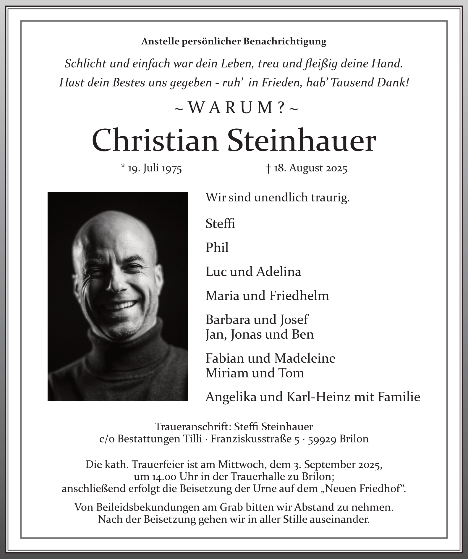 Liebe Familie Steinhauer, euer Mann, euer Papa, euer Sohn war ein wunderbarer Mensch. Ist euer Schmerz auch unermesslich, ihr könnt stolz und in Liebe auf Christian zurückblicken. Er hätte alles für euch gegeben und wäre euch sicher so gerne länger Wegbegleiter gewesen. Wir verstehen den Sinn nicht, dass die Besten leider zu oft zuerst geholt werden, aber er bleibt in unseren Herzen. In Dankbarkeit, Christian gekannt zu haben, eine Kollegin