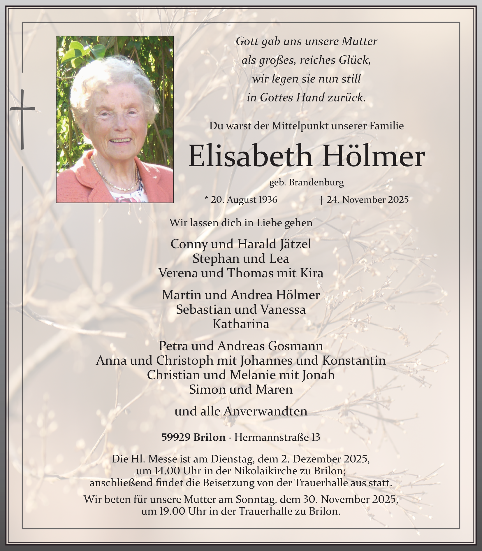 Die Hl. Messe ist am Dienstag, dem 2. Dezember 2025, um 14.00 Uhr in der „Nikolaikirche“ zu Brilon; anschließend findet die Beisetzung von der Trauerhalle aus statt.