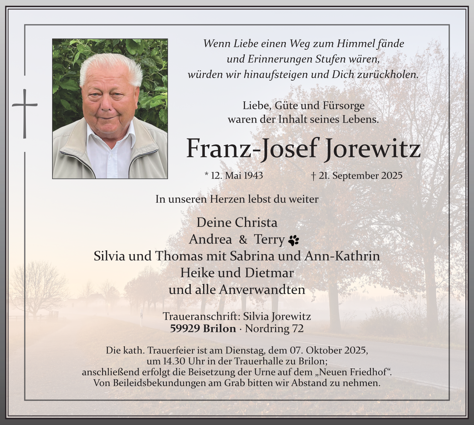 Die Trauerfeier ist am Dienstag, dem 07. Oktober 2025, um 14.30 Uhr in der Trauerhalle zu Brilon; anschließend erfolgt die Beisetzung der Urne auf dem „Neuen Friedhof“.