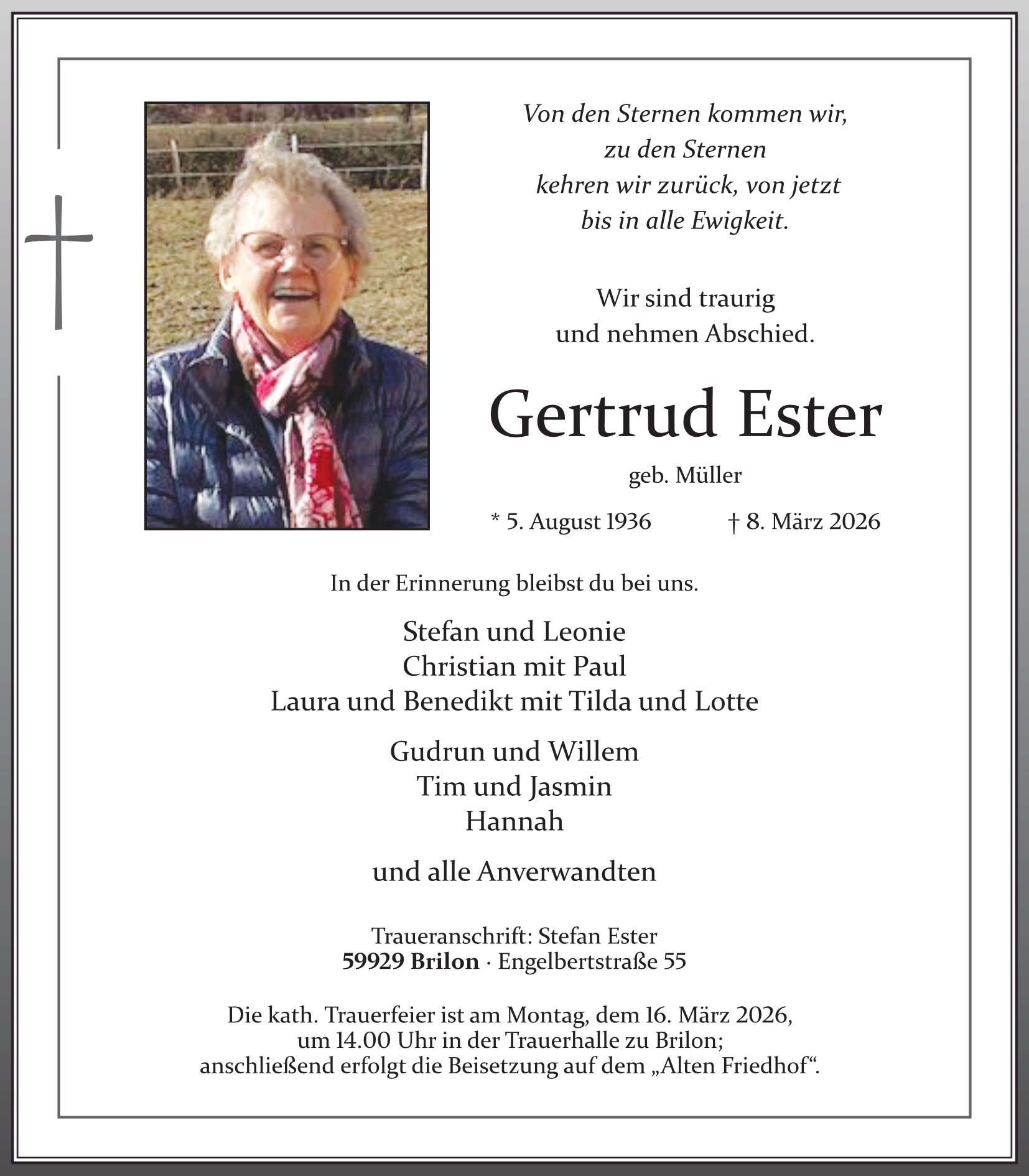 Die kath. Trauerfeier ist am Montag, dem 16. März 2026, um 14.00 Uhr in der Trauerhalle zu Brilon; anschließend erfolgt die Beisetzung auf dem „Alten Friedhof“.
