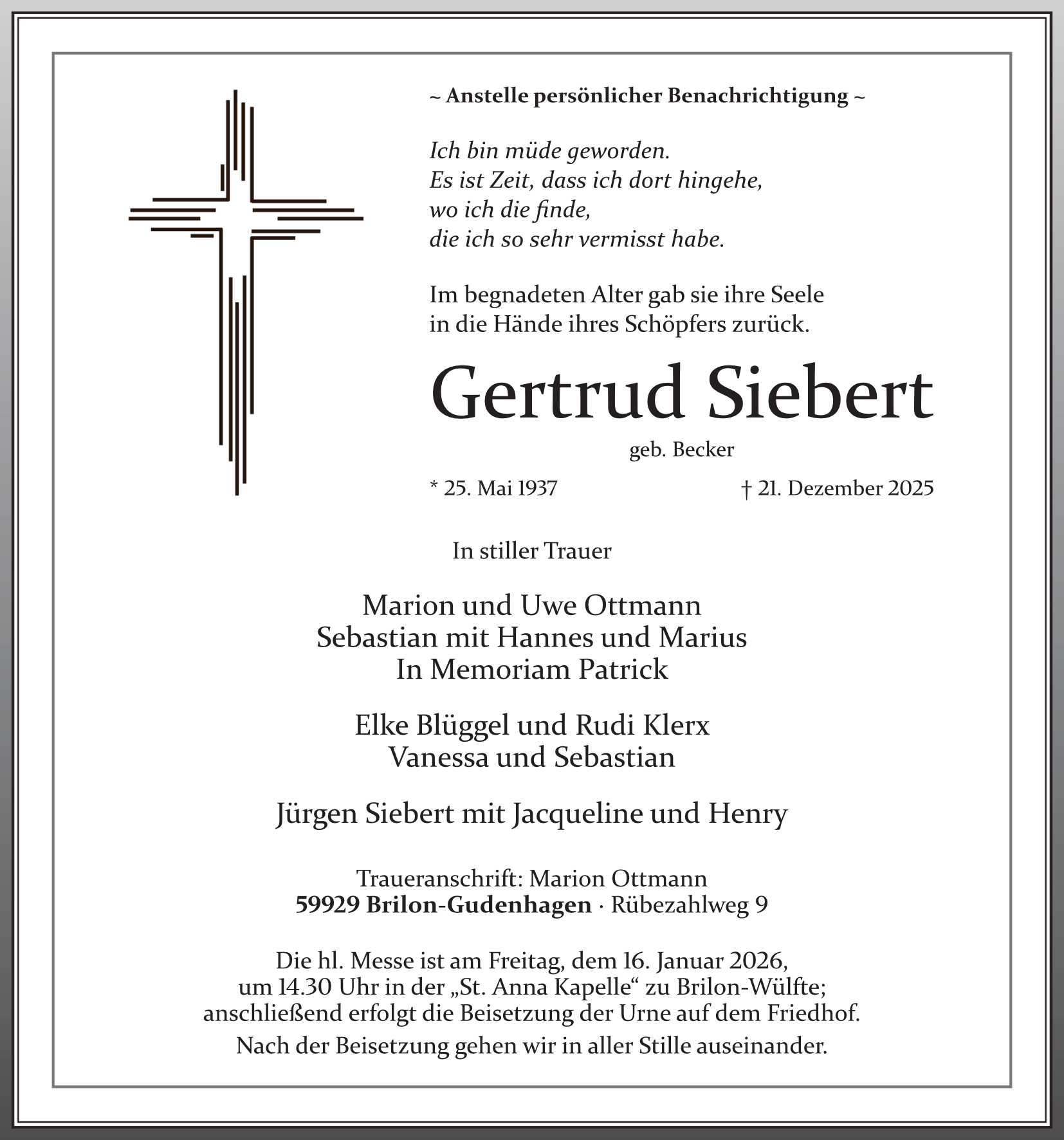 Die hl. Messe ist am Freitag, dem 16. Januar 2026, um 14.30 Uhr in der „St. Anna Kapelle“ zu Brilon-Wülfte; anschließend erfolgt die Beisetzung der Urne auf dem Friedhof.