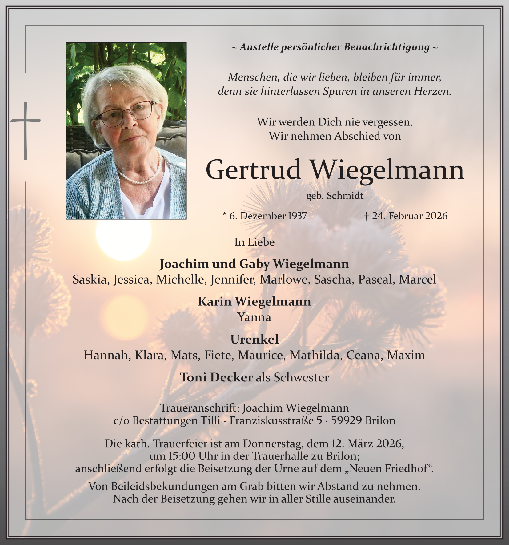 Die kath. Trauerfeier ist am Donnerstag, dem 12. März 2026, um 15.00 Uhr in der Trauerhalle zu Brilon; anschließend erfolgt die Beisetzung der Urne auf dem „Neuen Friedhof“.