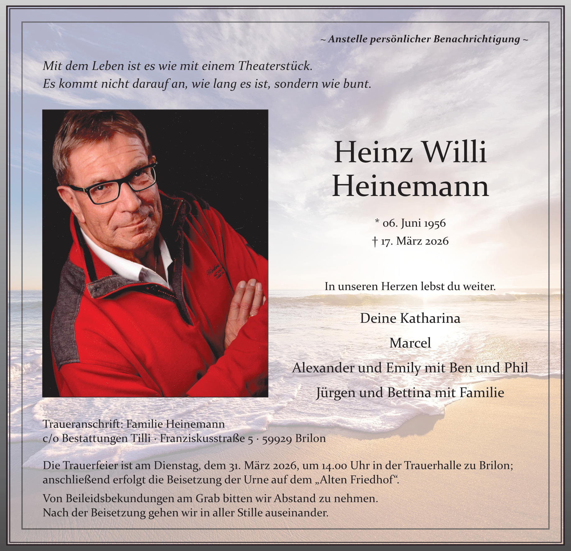 Die Trauerfeier ist am Dienstag, dem 31. März 2026, um 14.00 Uhr in der Trauerhalle zu Brilon; anschließend erfolgt die Beisetzung der Urne auf dem „Alten Friedhof“.