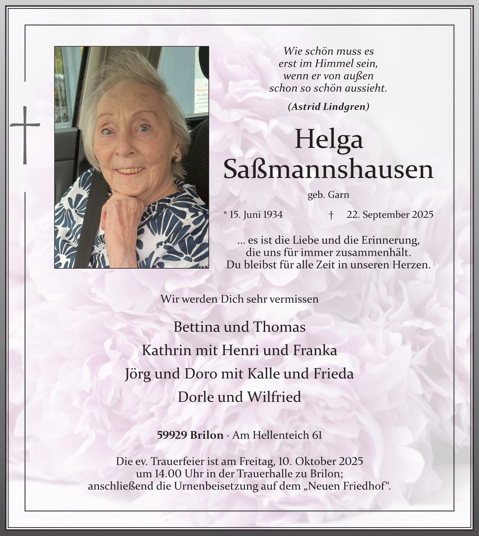 Die ev. Trauerfeier ist am Freitag, dem 10. Oktober 2025, um 14.00 Uhr in der Trauerhalle zu Brilon; anschließend erfolgt die Beisetzung der Urne auf dem „Neuen Friedhof“.