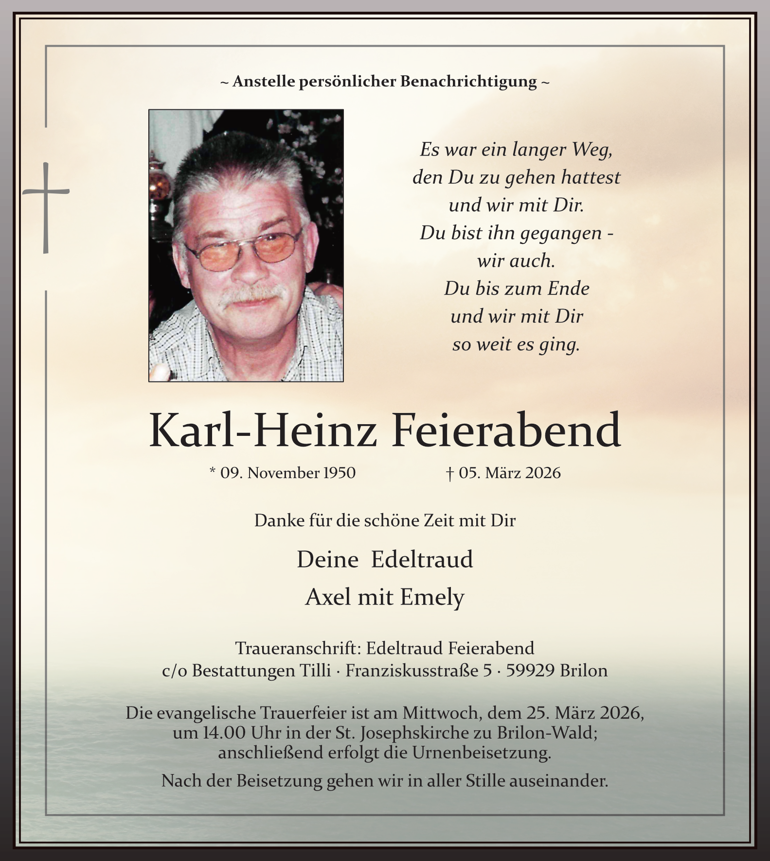 Die evangelische Trauerfeier ist am Mittwoch, dem 25. März 2026, um 14.00 Uhr in der St. Josephskirche zu Brilon-Wald; anschließend erfolgt die Urnenbeisetzung.
