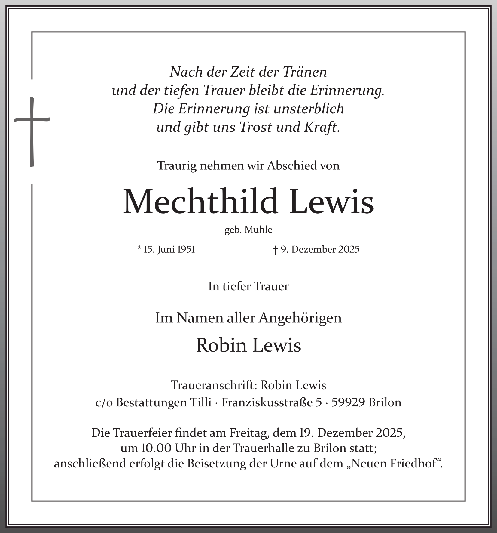 Die Trauerfeier findet am Freitag, dem 19. Dezember 2025, um 10.00 Uhr in der Trauerhalle zu Brilon statt; anschließend erfolgt die Beisetzung der Urne auf dem „Neuen Friedhof“.