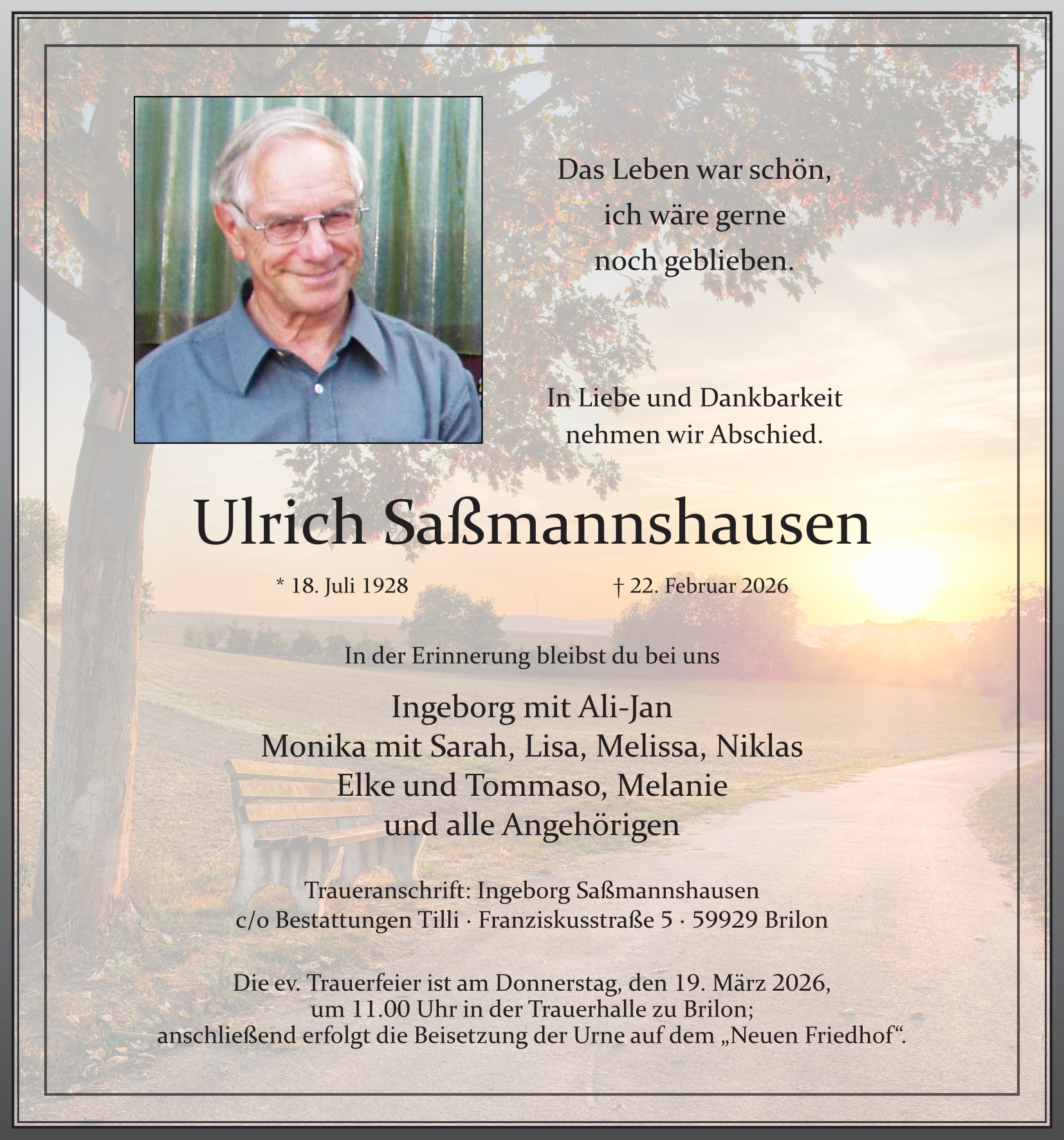 Die ev. Trauerfeier ist am Donnerstag, dem 19. März 2026, um 11.00 Uhr in der Trauerhalle zu Brilon; anschließend erfolgt die Beisetzung der Urne auf dem „Neuen Friedhof“.