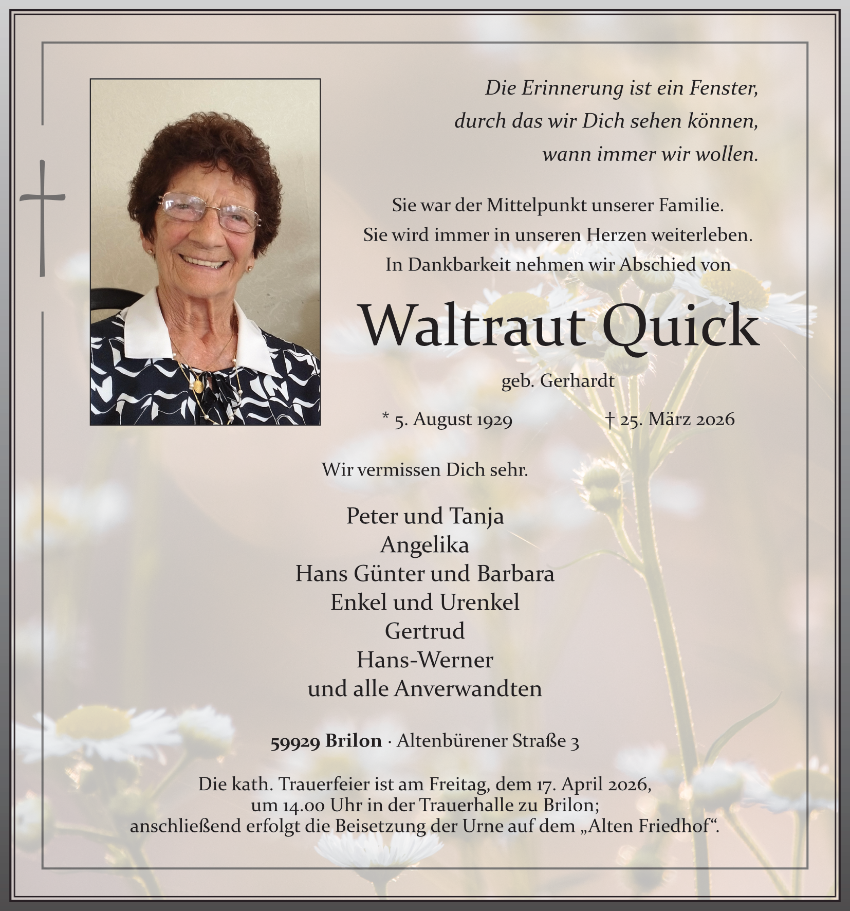 Die kath. Trauerfeier ist am Freitag, dem 17. April 2026, um 14.00 Uhr in der Trauerhalle zu Brilon; anschließend erfolgt die Beisetzung der Urne auf dem "Alten Friedhof".